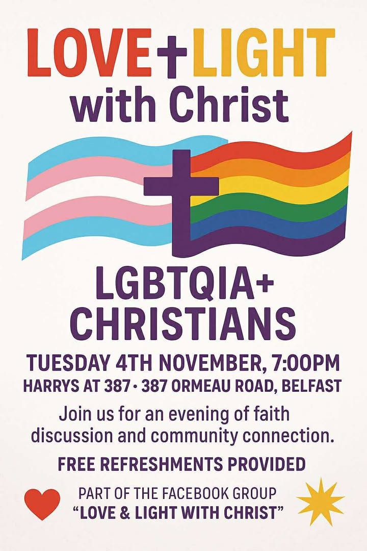Everyone is welcome at the Love + Light With Christ evening on 4th November. Some more info here: https://m.facebook.com/groups/1437668094030504/?ref=share