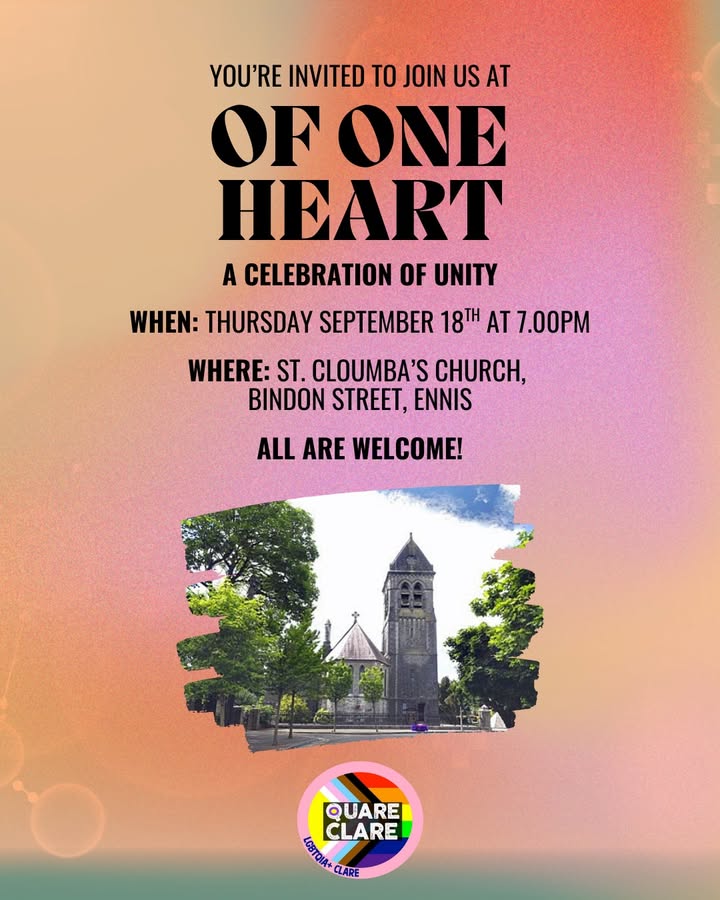 Our next event for Clare Pride will be our annual Service – Of One Heart, A Celebration of Unity.