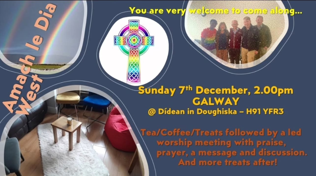 Our next meeting of Amach le Dia West is on Sunday 7th December in Galway. We will meet at Dídean in Doughiska (H91 YFR3). It’s a relaxed setting for a cuppa and chat and then a worship focused meeting with opportunity for discussion. You’ll be warmly welcome along.